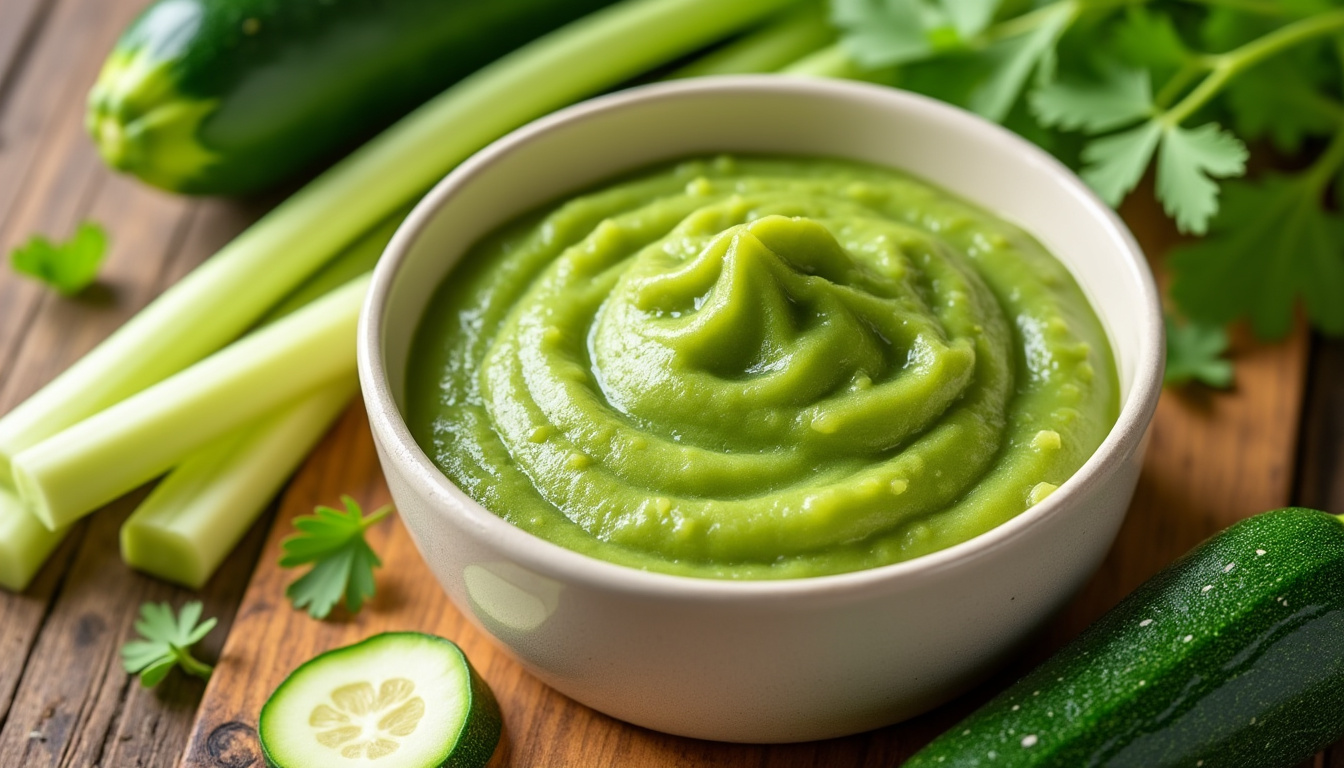 La purée céleri-branche et courgette, douce et équilibrée, est une recette idéale dès 6 mois pour initier bébé à de nouvelles saveurs tout en lui apportant des nutriments essentiels.